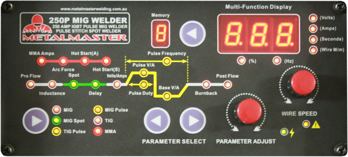 Pulse MIG welding has been simplified by allowing the operator quick access to the most recent setting so micro adjustments may be made on the fly. Different from standard MIG welding, the pulse feature allows two voltage characteristics, a ratio between them and a rate of repetition.